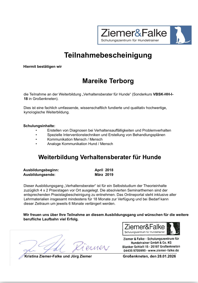 Direkt nach der Ausbildung zur Hundetrainerin habe ich bei Ziemer & Falke noch zusätzlich eine Weiterbildung zur Hunde-Verhaltensberaterin absolviert.